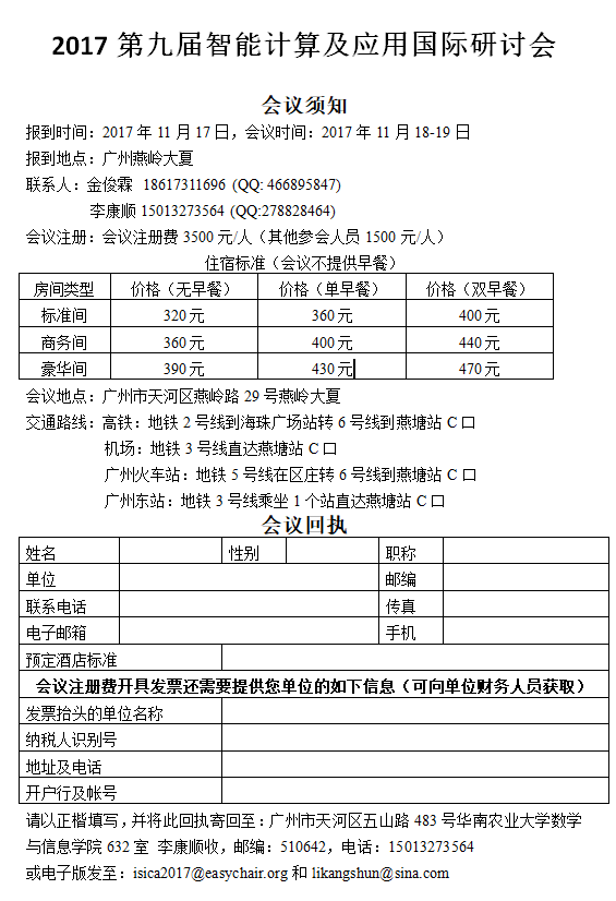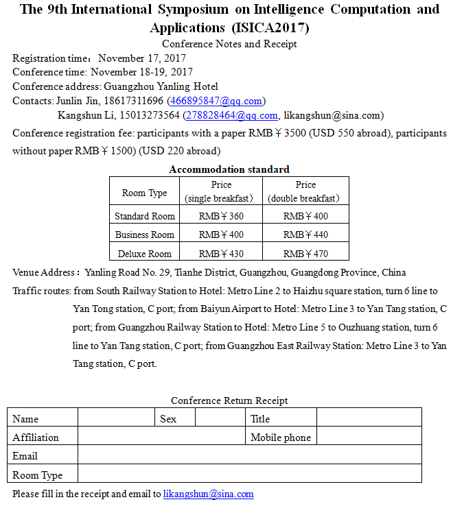 Note: One author for each accepted paper must complete the registration by bank transfer before November 1st, 2017 in order for your papers to be included in the conference proceedings.The conference registration fee includes all conference sessions, proceedings, coffee breaks, lunches, reception, banquet, and etc.